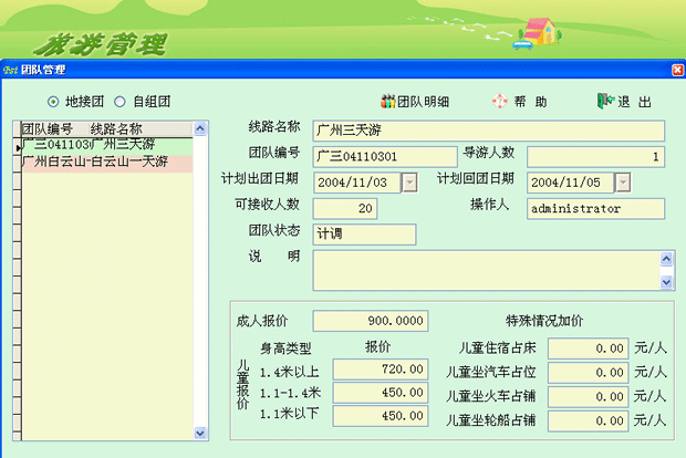 • 4.團隊計調模塊。團隊計調主要分為團隊操作和計調操作兩大部分,在形式上分為地接團操作和自組團操作兩種。在團隊操作中主要通過“團隊明細”顯示團隊信息。團隊信息包括線路日程安排、團隊報價、團隊報名信息、團隊計調狀態。在計調操作中主要分為訂房、訂車、訂餐、訂票、分配導游等操作過程。以上各操作過程中計調人員可以通過信息庫來查找自己想要的信息。