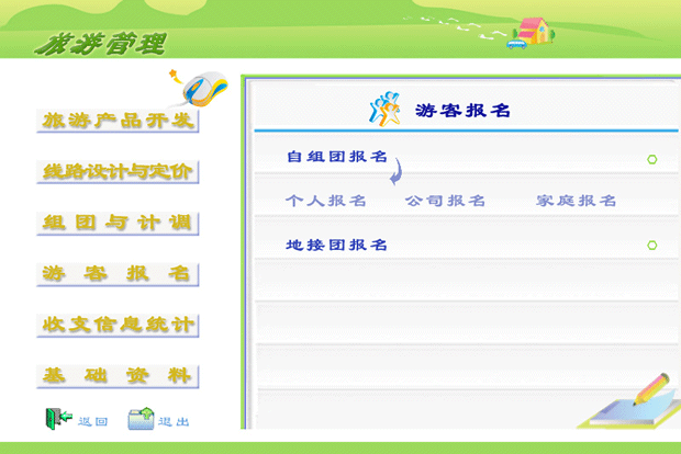 • 5.前臺處理模塊。前臺處理模塊是服務于自組團的游客報名信息與數據錄入。在這里還提供了查詢團隊信息的功能。